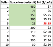 As an example, let’s say there are 10 sellers bidding for a total of 1000 cuft in available storage.
