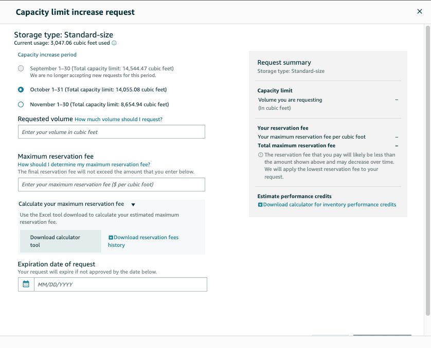 You “bid” for more storage using Amazon’s reservation fee system in Capacity Manager. Put simply, you request additional capacity by specifying a reservation fee you’re willing to pay per cubic foot. Amazon evaluates capacity availability and grants requests, prioritizing those with the highest reservation fees.