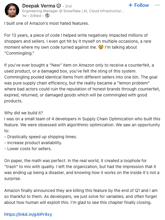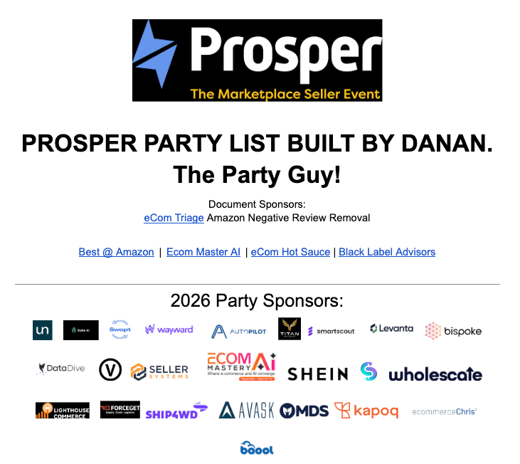 Point is... This AI world is moving super fast, and seemingly viable (or exciting!) businesses are replaced overnight. Your vibe-coded tool is not going to survive. My suggestion to you... Focus on AI adaption, not AI adoption. That is... Your focus should be adapting AI to how you and/or your company currently work. Find a workflow that takes too much time, or that you have to repeat on a regular basis, and engineer AI into it so that you either get a better or faster output. Resist the urge to jump between AI platforms. Resist the urge to commercialize something that you built to solve your own problems. Resist the urge to adopt something that someone else said was a "game-changer" for them. BEST from my InboxIf you're headed to Prosper next week, you're probably planning to network with Amazon and eCommerce peers. My buddy Danan from Ecom Triage (aka The Party Guy) is once here to help, with a curated list of all of the Prosper adjacent activities. (Bookmark this) Thanks, Danan! BEST from LinkedInCommingling at Amazon fulfillment centers is going away on March 31. WOO! This isn't new-news -- it was announced in September 2025 at Amazon Accelerate (to a chorus of cheers from the audience!). I'm mentioning it, though, because this LinkedIn post from Deepak explains why "bad ideas" regularly get "shipped" at Amazon. Thanks, Deepak, for sharing. BEST from XMeanwhile, in the Amazon Aggregator world, the dominos keep falling... β οΈβ οΈ